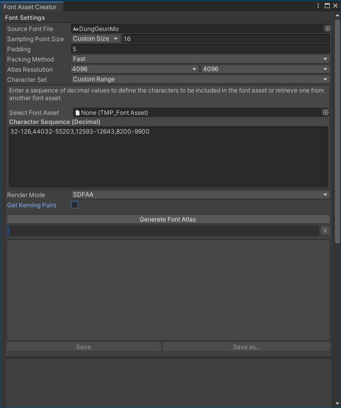 위 숫자는 아스키코드, 유니코드에서 각 언어의 범위입니다. 사용하는 폰트가 지원하는 언어에 맞는 유니코드 숫자를 써주시면 됩니다. 보통은 영어와 한글이면 충분하다고 생각되네요. 이후 Generate Font Atlas를 누르시고 나오는 문자를 Save as...로 에셋 폴더에 넣어주시면 됩니다.