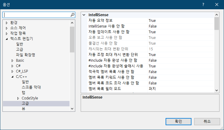 도구 -> 옵션 -> 덱스트 편집기 -> c/c++ -> 고급 에 들어가서