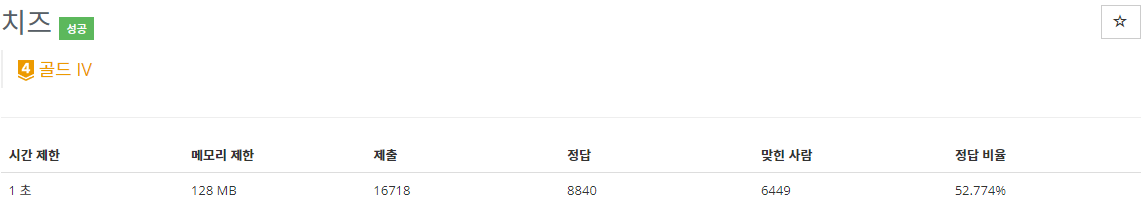 일단 BFS를 돌리면서 몇번 치즈가 녹는지를 보면 되는데 문제는 '겉면의 치즈만 녹는' 문제입니다. 이걸 어떻게 하지? 각 치즈 정점에서 돌려야 하나? 생각을 했는데 좌측 위에서 시작하면 안쪽 치즈들은 영향 없이 탐색할 수 있다는 아이디어가 있었습니다. 이 아이디어를 통해서 탐색을 돌리고 마지막에 녹은 기록이 없다면 출력을 해주면 됩니다.
