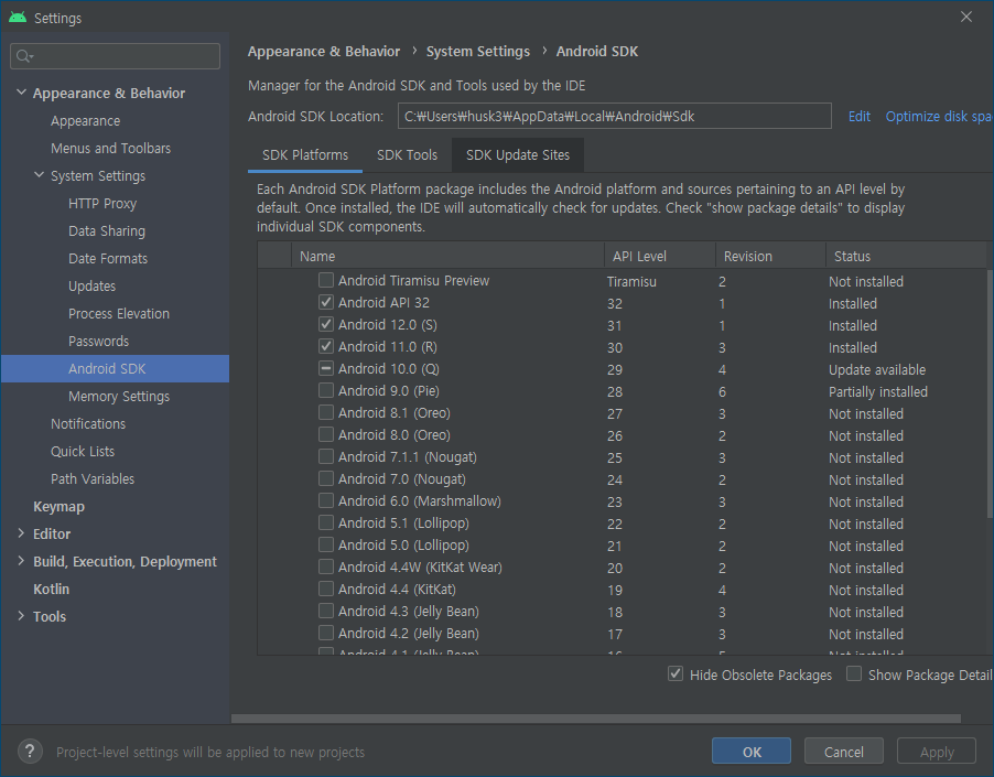 이후 [안드로이드 스튜디오 > SDK Manager > Appearance & Behavior > System Settings > Android SDK] 에서 위 사진처럼 API 레벨이 30 이상인 것들을 전부 받아주시면 됩니다.