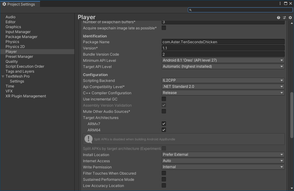 [Project Settings > Player > Other Settings > Configuration] 에서 Scripting Backend를 IL2CPP, ARM 64를 체크하신 뒤 빌드해 주시면 됩니다.