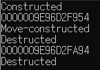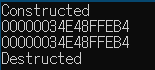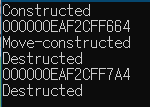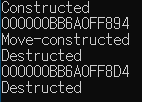 #include <iostream> struct Foo { Foo() { std::cout << "Constructed" << std::endl; } Foo(const Foo&) { std::cout << "Copy-constructed" << std::endl; } Foo(Foo&&) { std::cout << "Move-constructed" << std::endl; } ~Foo() { std::cout << "Destructed" << std::endl; } }; Foo Func() { Foo f; std::cout << &f << '\n'; return f; } int main() { Foo f1{ Func() }; std::cout << &f1 << '\n'; return 0; }여러가지 장난을 쳐본 결과 일단 Debug 모드에서는 move constructor가 불렸습니다. Release 모드에서는 이와 관련한 RVO, NRVO가 켜져 있다고 했는데 이 덕분인지 Foo에서는 Constructored, Destructored만 불리게 되었습니다.