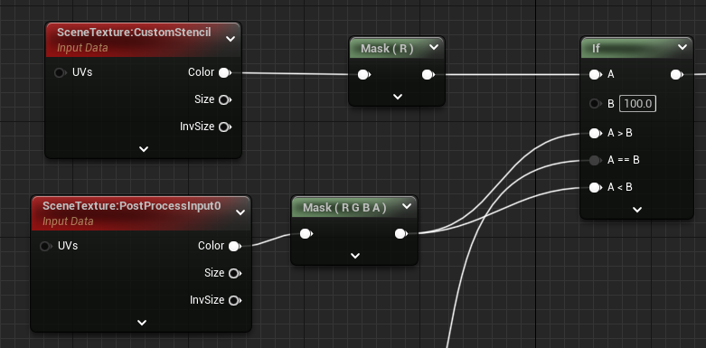 그런데 아웃라인 효과와 투시 효과는 각자 다른 메쉬들에게 이루어져야 했고 이들을 구분하기 위해 Stencil 값을 활용했습니다. CustomDepth Stencil Value를 활용하면 0~255까지의 수로 구분을 할 수 있어 아웃라인 효과는 50, 투영 효과는 100으로 할당해 줬습니다.