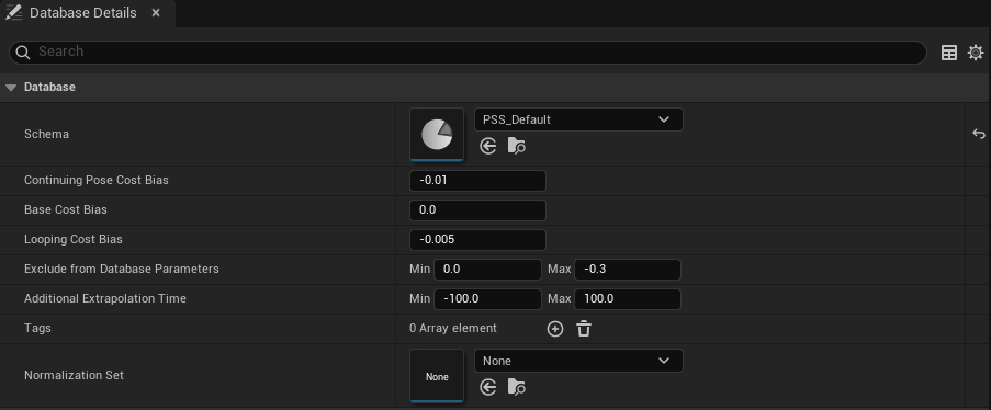 에픽의 샘플들의 값이 높지 않아 값은 적게 유지하는게 좋아 보입니다.Exclude from Database Parameters 애니메이션의 첫/마지막 프레임중 어디까지 평가할 지 설정 가능합니다. 블랜딩을 시도할때 해당 부분을 제외하고 계산하게 됩니다. Additional Extrapolation Time 애니메이션 블랜딩 할 때 사용 가능한 값이며 애니메이션의 추가 시간을 주거나 값을 줄여 적게 나오게 할 수 있습니다. Tags Pivoting, Turning 등의 특수한 데이터베이스를 '사용중이다' 를 알고 싶다면 Tags 의 변수들로 구별이 가능하며 해당 태그들은 FGameplayTag 와는 관계가 없는 FName 변수입니다. Normalization Set PSN 을 지정할 수 있으며 필수가 아닙니다. 다만 지정하면 탐색 시 더 효율적이게 됩니다. PSN - Pose Search Normalization