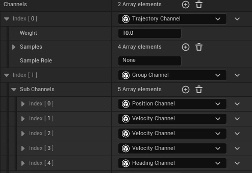 채널명 설명 Trajectory Channel 이후 설명할 Trajectory 와 함께 사용되는 채널입니다. Group Channel 해당 채널 자체로는 하는 일이 없으며 하위 채널들을 묶는 역할을 합니다. Position Channel 다른 본을 기준으로 특정 본이 어느 위치에 있는지를 분석합니다. 주로 foot_l,r 을 비교해 발 방향을 결정하는데 사용합니다. Velocity Channel 캐릭터의 현재 포즈, 지속 포즈를 기반으로 캐릭터, 월드 스페이스에서 속도를 계산합니다. Heading Channel 애니메이션의 방향을 분석할 수 있습니다. 보통 Pelvis 를 기반으로 합니다. 그 외 채널들도 있으며 상황에 따라 적절한 조합으로 가능할 것 같으나 저 같은 경우 현재 Locomotion에서만 주로 사용 중이라 그 외의 채널들의 경우 차차 공부해 나갈 예정입니다.