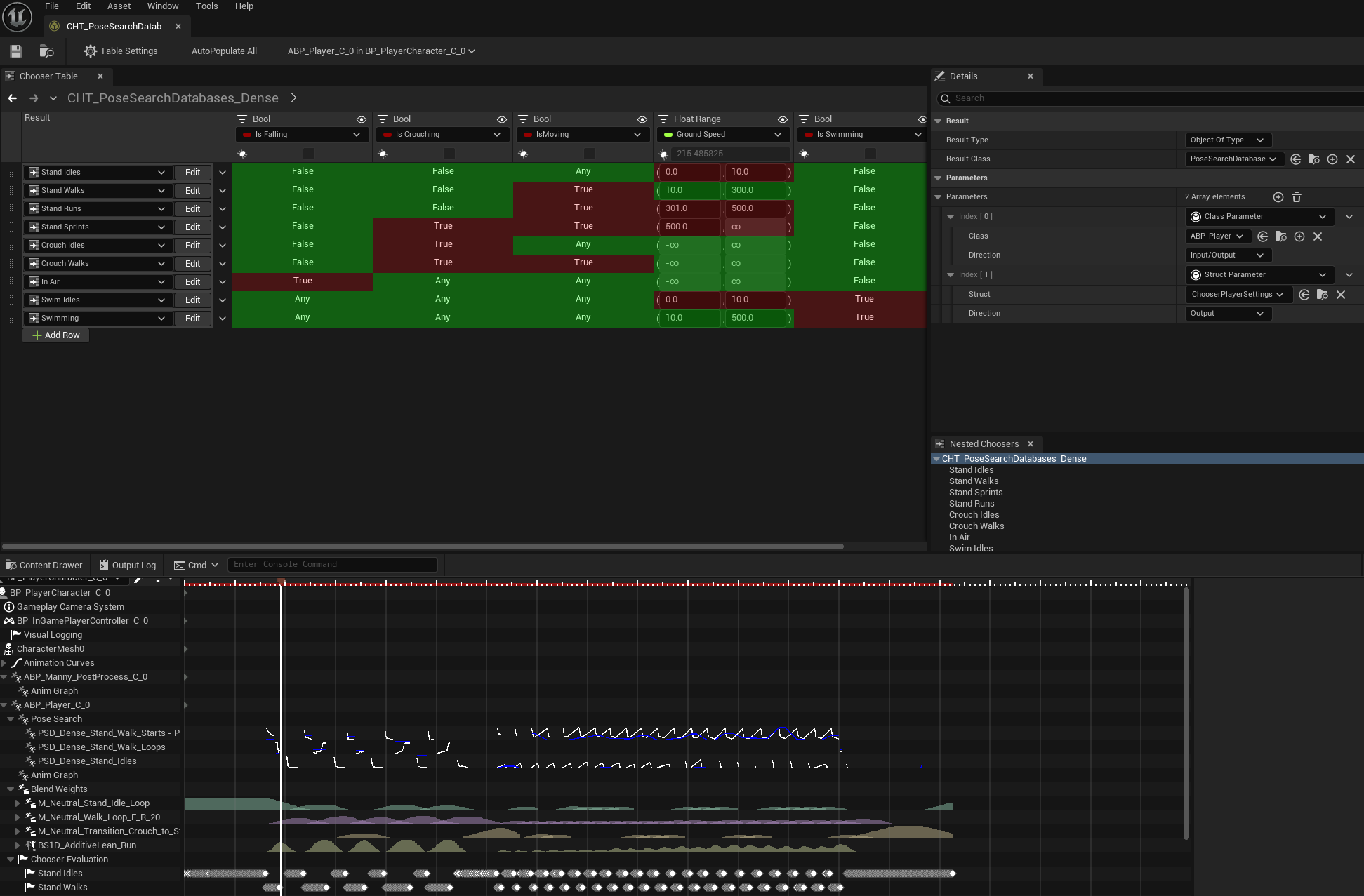 Chooser Table 과 동일하게 왼쪽 위 액터 목록에서 원하는 타겟을 지정하면 녹화가 가능합니다. 플레이가 끝나면, 또는 녹화를 끝내면 일단 저장되고 위 움짤처럼 동영상처럼 재생할 수 있습니다. 이상한 애니메이션이 나왔다면 해당 시점으로 커서를 옮겨 어떤 애니메이션이 나왔는지 볼 수 있습니다. 또한 위에서 언급한 대로 Chooser Table에서 디버그 타겟을 설정했다면 리와인드 디버거에서 커서를 옮기면 해당 시점의 Chooser Table 상태가 나오게 됩니다. 이 경우 Nested로 설정해도 디버깅하기 편해집니다.