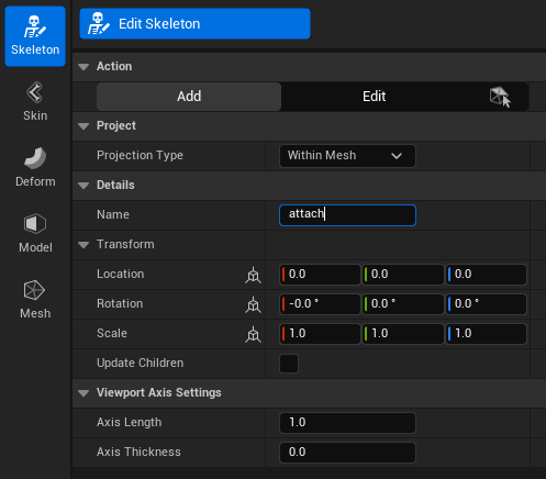 이후 나오는 본 목록에서 부모가 될 본을 우클릭한 뒤 이름을 붙이면 됩니다. 저의 경우 Game Animation Sample Project 처럼 만드는게 목표기 때문에 root 본 아래 자식으로 attach 라는 이름의 본을 추가하였습니다.