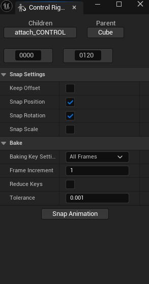 이후 나오는 창은 여러 애니메이션을 수정할 생각이라면 어딘가에 고정해두면 잘 사용할 수 있습니다. 여기서 Children 은 원하는 본으로, Parent 는 월드에 배치된 큐브를 두면 됩니다. 원하는 오브젝트를 지정하는 방법은 월드나 Sequencer 창에서 선택한 후 ‘Children’, ‘Parent’ 아래 버튼을 누르면 됩니다.