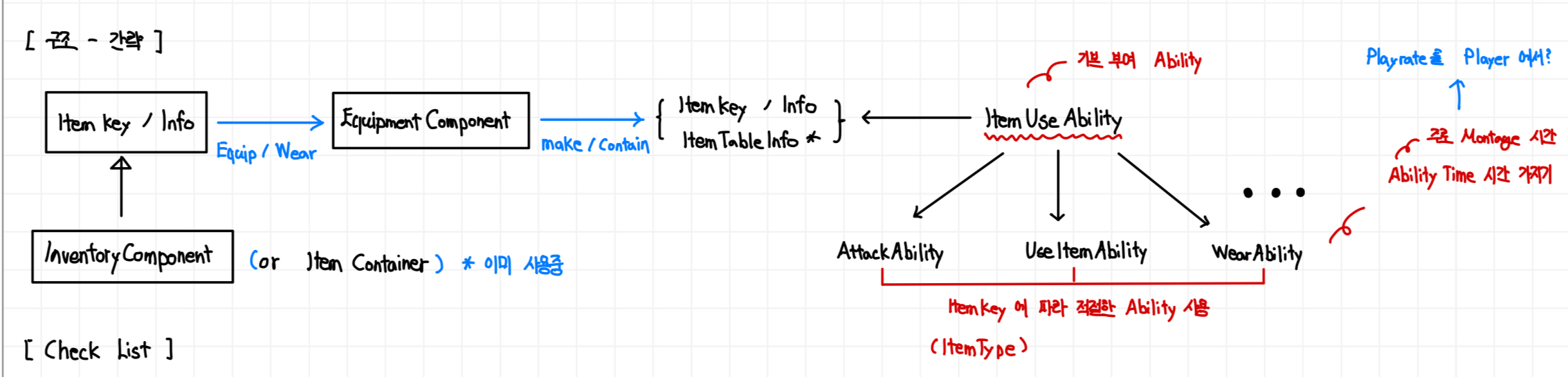 이때의 구조는 만들 당시에도 괴랄하다 생각했습니다. ’ 아이템 정보를 리플리케이트 하면 DS/Client에서 각각 아이템 클래스를 만들기‘ 였는데 말하자니 좀 부끄럽네요. 많은 우려점이 있는 구조였으니 ’ 잘못되었다 ‘라고만 이야기를 하고 빠르게 넘기도록 하겠습니다. 부끄럽거든요.[ 3 ] 현재의 모습, 어빌리티를 활용해 아이템 클래스를 제거