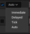 옵션 설명 Immediate 변수가 변경되는 즉시 이벤트를 활성화 합니다. Delayed 변수가 변경된 후 해당 프레임의 마지막에서 이벤트를 활성화 합니다. Tick 프레임의 마지막 시점에 Tick 단위로 항상 이벤트를 활성화 합니다. Auto