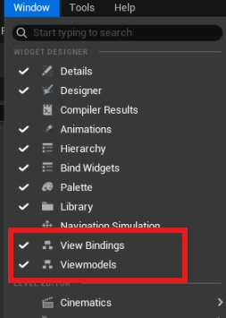 해당하는 UMG 의 Blueprint에서 View Bindings, Viewmodels를 위 사진의 메뉴에서 활성화하여야 설정이 가능합니다.