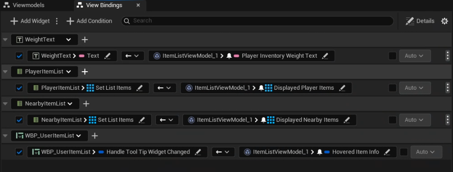 이후 View Bindings에서 해당하는 위젯 요소들, 함수에 대해서 바인딩을 추가할 수 있습니다. 여기서 볼 건 중간의 화살표와 Auto로 되어 있는 드롭박스이며 이는 아래 표에서 설명하도록 하겠습니다.