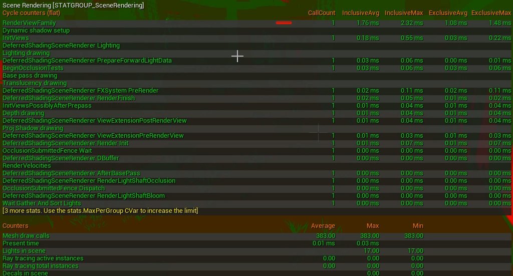 최적화 후에는 액터 수를 1/8 수준인 1705개로 줄였습니다. 최적화 도중도중 여러 프랍들을 설치했지만 그를 무시해도 액터 수는 드라마틱하게 줄었다고 볼 수 있습니다. RenderViewFamily도 평균이 1ms로 줄여져 많이 줄게 되었습니다.